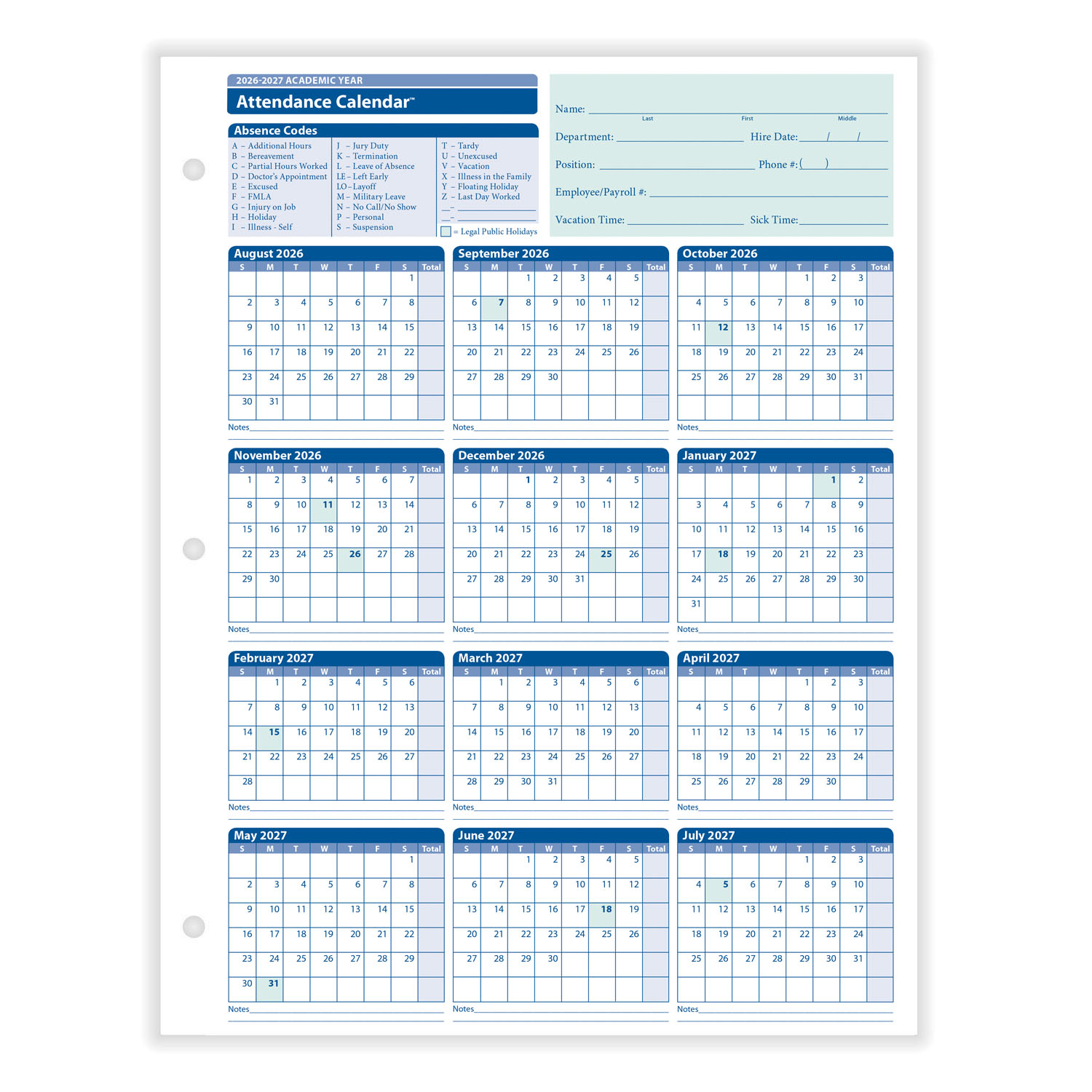 • Efficient calendar format makes tracking absences quick and convenient